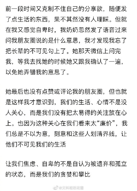 明白了生活是自己的日子是过给自己看的,不需要向别人证明。看过一个热门问题:不发朋友圈动态的人,是出于什么心态?有一个高赞的回答:“因为所有的朋友圈,都以私聊的方式发给在乎的人了。”深以为然。活在朋友圈里的人,生活未必精彩,从朋友圈里消失的人,生活也未必糟糕。他们不发朋友圈了,恰恰是因为找到了与他人、与自己相处的最好方式。