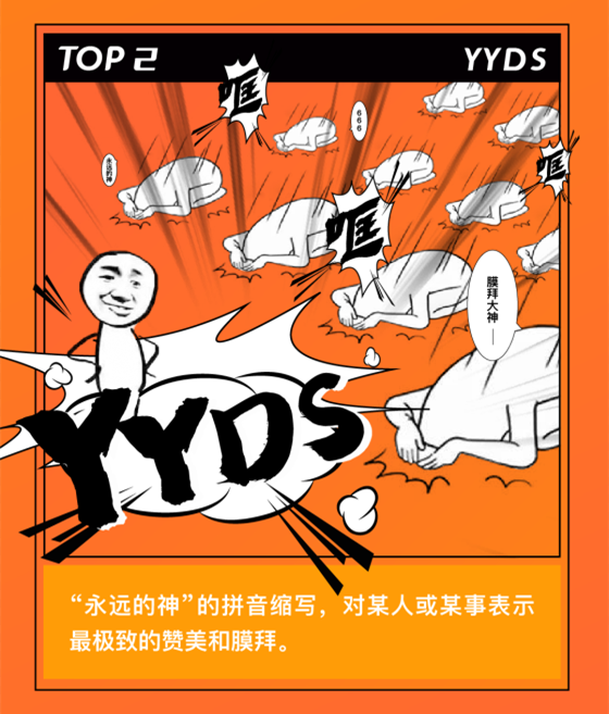 yyds 是“永远的神”拼音首字母的缩写,用来表达对于某个人、某个组织或者某件事最极致的赞美和膜拜。比如在今年的奥运会上,一众运动员的神技能、神操作,让网友直呼中国队 yyds!