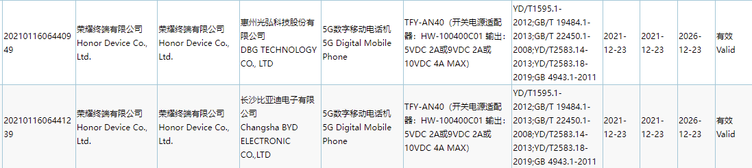 29 日消息,荣耀近日有多款产品通过了国家 3C 质量认证,其中一款型号为 TFY-AN40 被爆料称是此前发布的荣耀 X30i 的衍生版本。