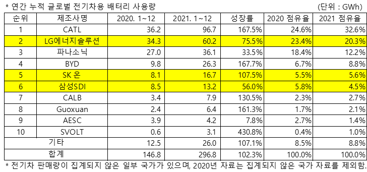 7 日消息,韩国市场研究机构 SNE Research 发布 2021 年全球动力电池装机量排行榜。