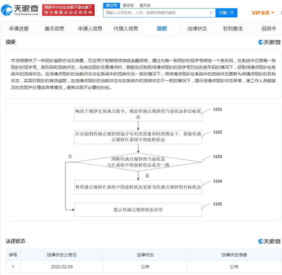 8 日消息,信息显示,2 月 8 日,中国银行股份有限公司申请的“一种现钞追踪方法及装置”专利公布。