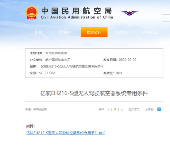 24 日消息,中国民航局于 22 日发布了《亿航 EH216-S 型无人驾驶航空器系统专用条件》,自 2022 年 2 月 9 日起生效。