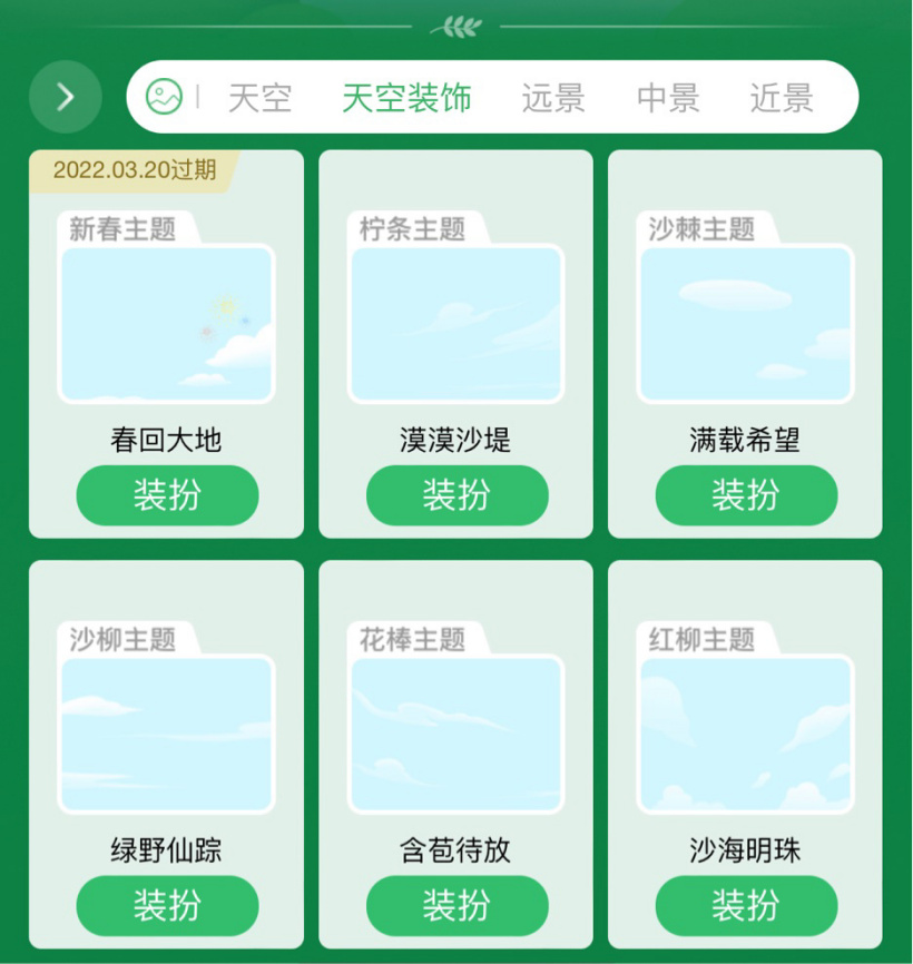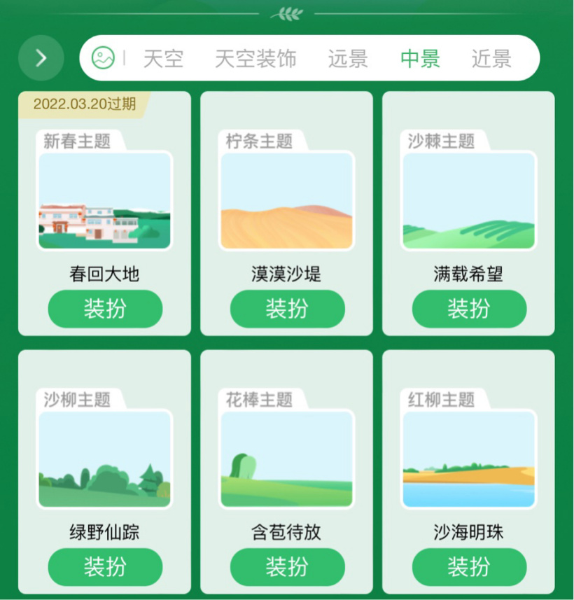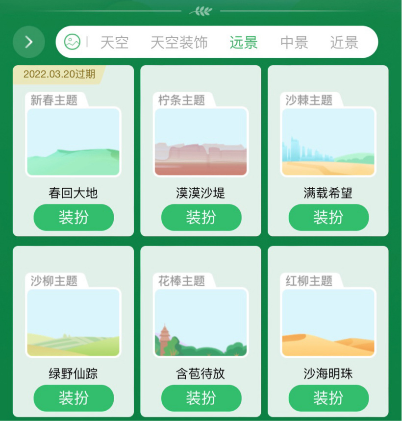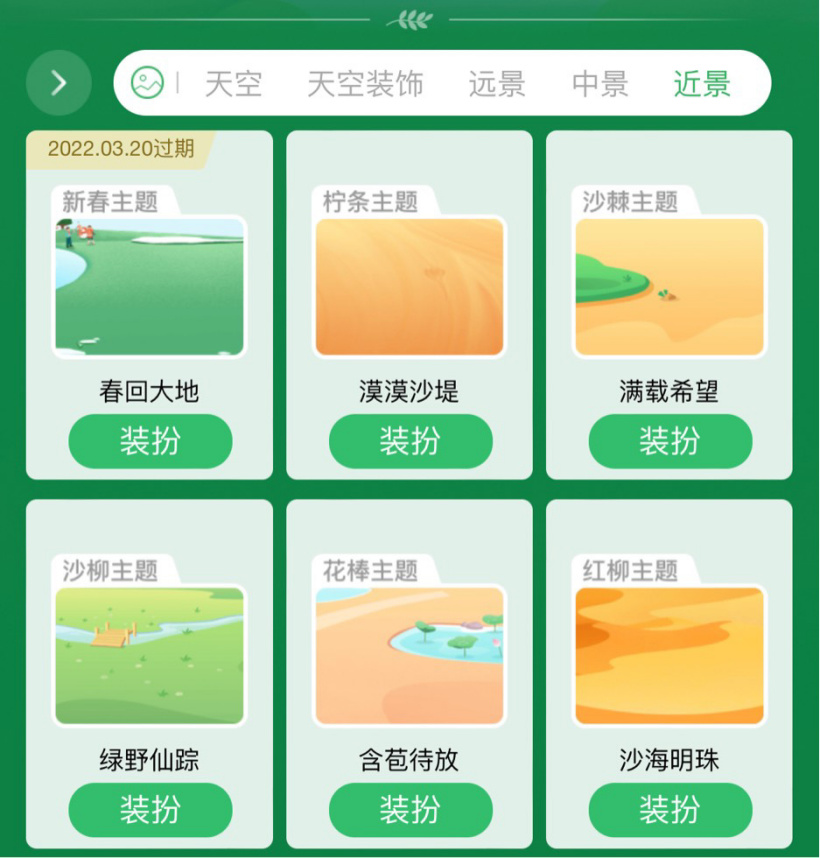 其中包括新春主题-春回大地(3 月 20 日过期)、柠条主题-漠漠沙堤、沙棘主题-满载希望、沙柳主题-绿野仙踪、花棒主题-含苞待放、红柳主题-沙海明珠、梭梭树主题-沙漠之舟、樟子松主题-青青不朽等等。这与用户种植的树木有关。