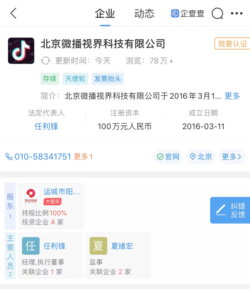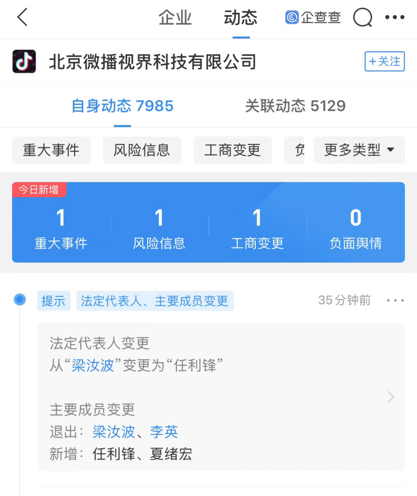 创始人梁汝波卸任抖音法定代表人,由任利锋接任!