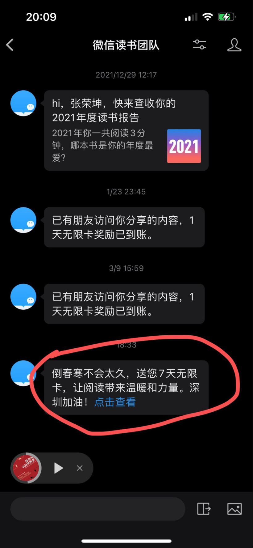 此外,微信读书也为用户送出了 7 天无限阅读卡,目前已有部分小伙伴收到。