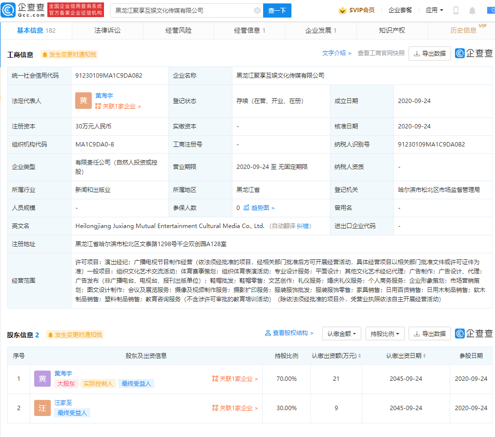 企查查 App 显示,黑龙江聚享互娱文化传媒有限公司,该公司成立于 2020 年 9 月,注册资本 30 万元,执行董事兼总经理、法定代表人为黄海宇,值得注意的是,该公司参保人数为 0。