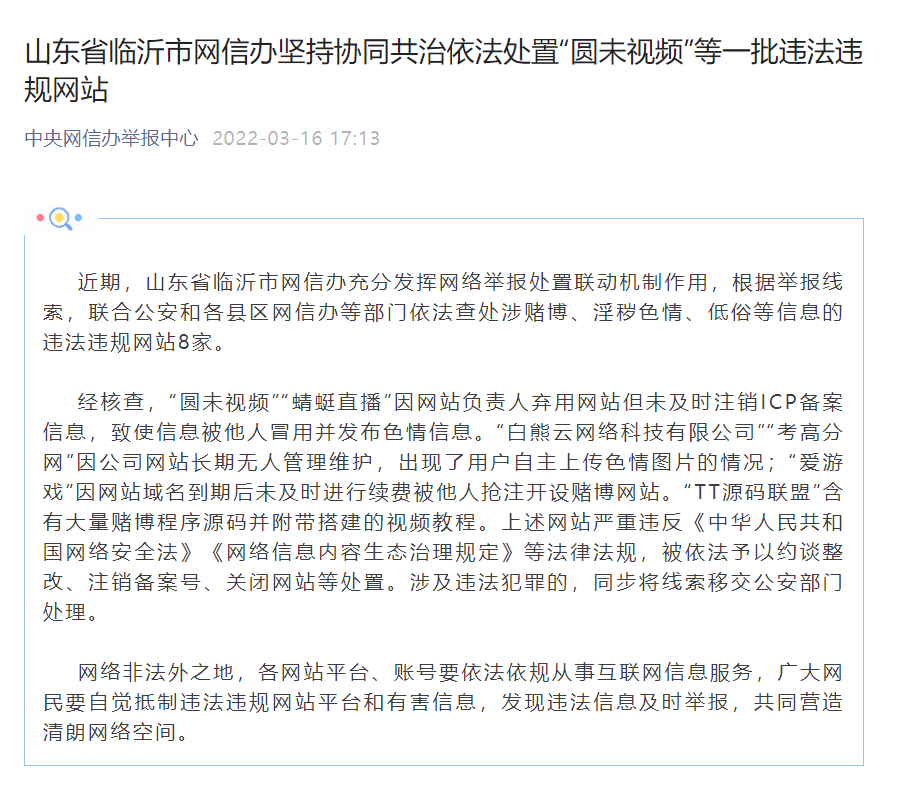 经核查,“圆未视频”“蜻蜓直播”因网站负责人弃用网站但未及时注销 ICP 备案信息,致使信息被他人冒用并发布色情信息。“白熊云网络科技有限公司”“考高分网”因公司网站长期无人管理维护,出现了用户自主上传色情图片的情况;“爱游戏”因网站域名到期后未及时进行续费被他人抢注开设赌博网站。“TT 源码联盟”含有大量赌博程序源码并附带搭建的视频教程。上述网站严重违反《中华人民共和国网络安全法》《网络信息内容生态治理规定》等法律法规,被依法予以约谈整改、注销备案号、关闭网站等处置。涉及违法犯罪的,同步将线索移交公安部门处理。
