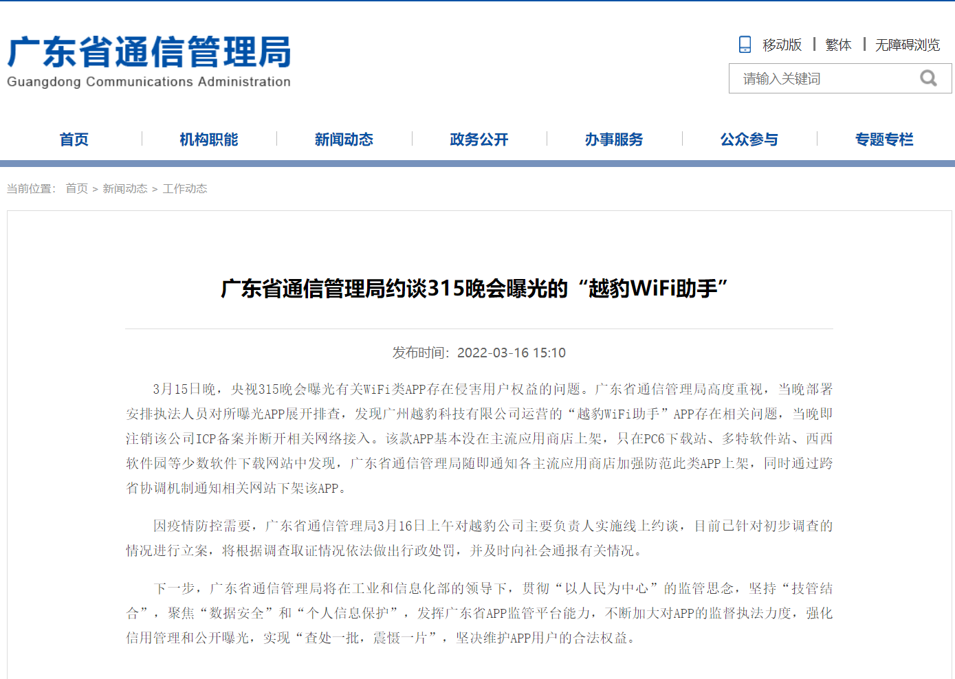 广东省通信管理局:已断开 315 晚会曝光的“越豹 WiFi 助手”