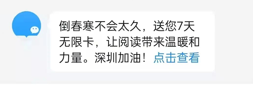 微信读书还给深圳朋友们赠送 7 天无限卡,打开微信读书 App 即可领取。