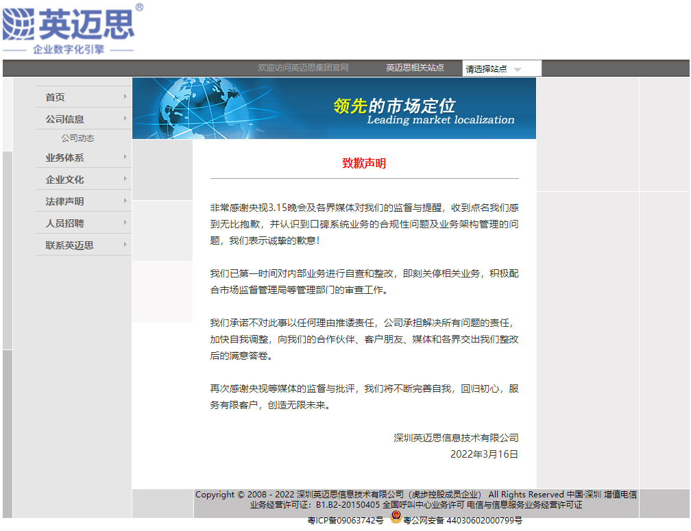 非常感谢央视 3.15 晚会及各界媒体对我们的监督与提醒,收到点名我们感到无比抱歉,并认识到口碑系统业务的合规性问题及业务架构管理的问题,我们表示诚挚的歉意!