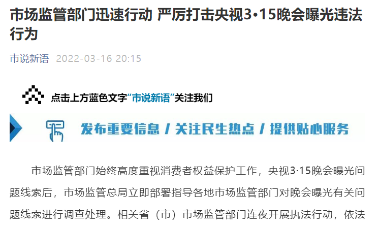 国家市场监督管理总局今日发文,央视 315 晚会曝光问题线索后,市场监管总局立即部署指导各地市场监管部门对晚会曝光有关问题线索进行调查处理。相关省(市)市场监管部门连夜开展执法行动,依法严厉查处侵害消费者权益违法行为。