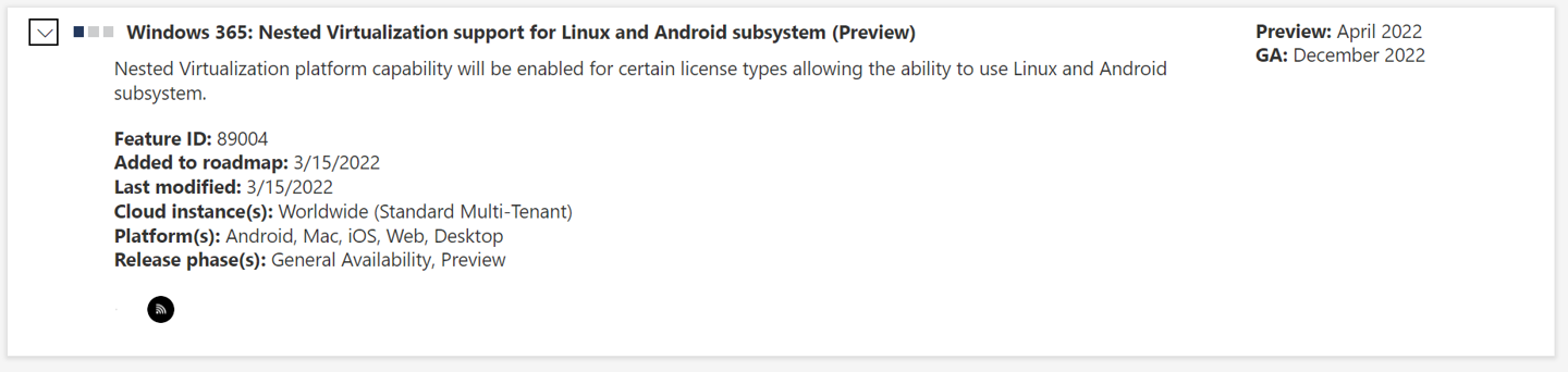 现在,微软宣布正在为 Windows 365 云电脑带来嵌套虚拟化的支持,包括支持 Linux 和 Android 的 Windows 子系统的预览版。这意味着企业可以在 Hyper-V Windows 365 虚拟机中运行 Hyper-V,并直接在其中运行 Linux 和 WSA。