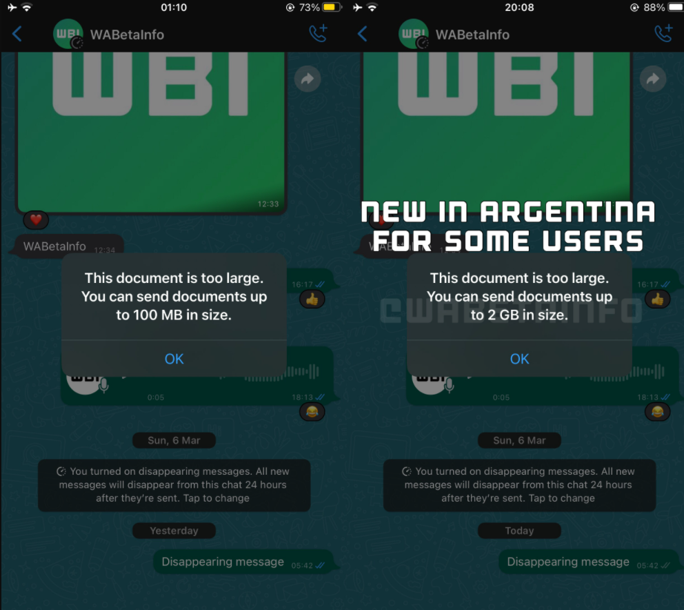 然而,根据 WABetaInfo 分享的 iOS 屏幕截图,过去几天,WhatsApp 一直在为阿根廷的部分用户测试 2GB 文件大小限制,这些文件也可以通过 WhatsApp 的端到端加密安全传输。