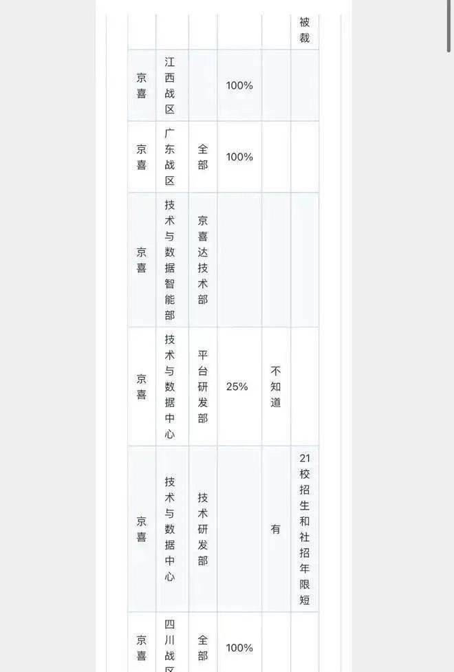 京喜也是裁员较多的业务。一位京东员工向第一财经提供了一份关于京喜裁员的截图。 截图显示,京喜广东战区、四川战区和江西战区裁员比例为100%。此外,京喜平台研发部裁员25%,技术研发部也有部分裁员。