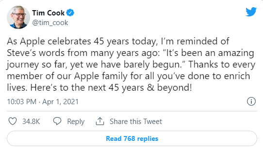 去年 4 月 1 日,CEO 蒂姆?库克在纪念苹果公司成立 45 周年时发了一条推特,回顾了他的朋友和同事、联合创始人史蒂夫?乔布斯。