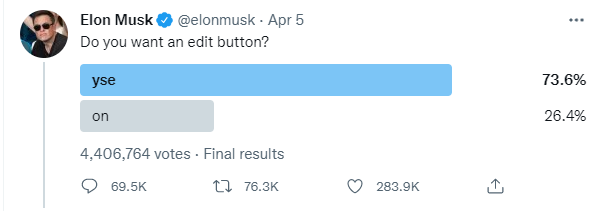 马斯克发起的投票Twitter 是否需要“编辑”按钮