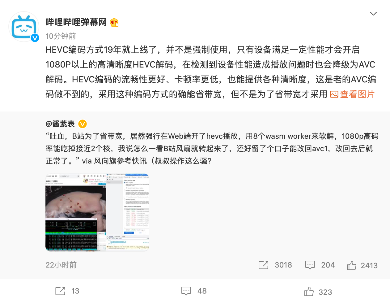 对此,B站官方进行了回应,称未在 Web 端强行开启 HEVC 播放,设备满足一定性能才会开启。