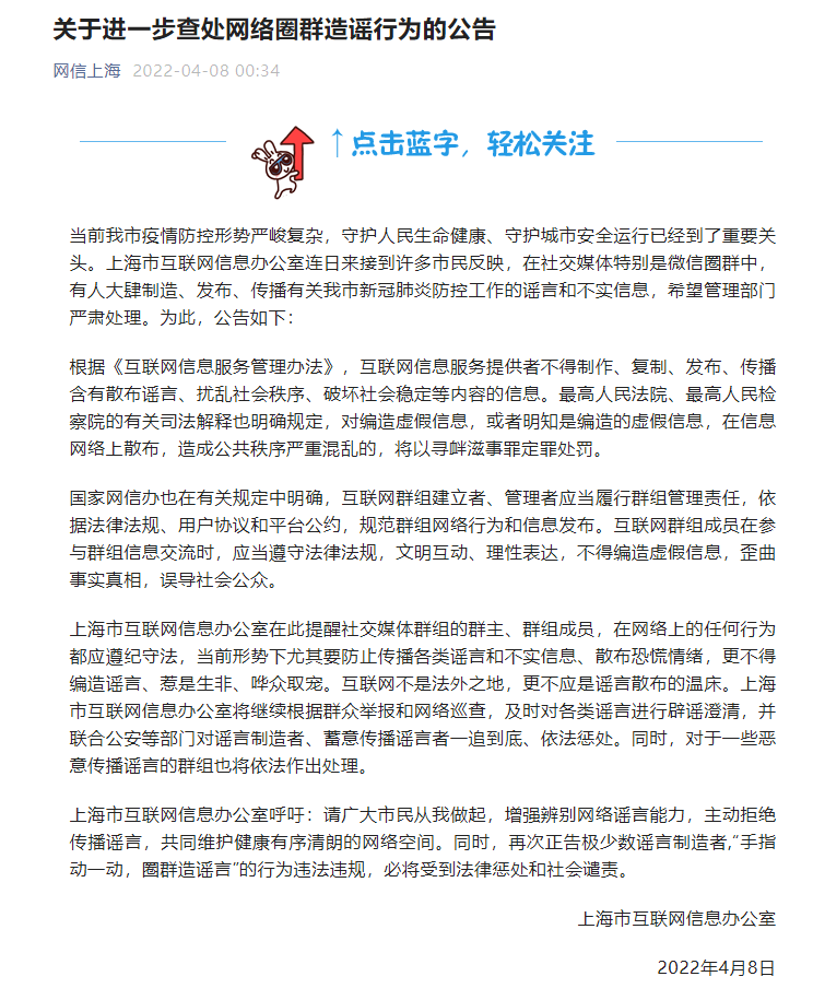 上海市委网信办在此提醒社交媒体群组的群主、群组成员,在网络上的任何行为都要遵纪守法,当前局势下尤其要防止传播各类谣言、不实信息,散布恐慌情绪,更不得编造谣言惹是生非、哗众取宠。互联网不是法外之地,更不应是谣言散布的温床。上海市委网信办将继续根据群众举报和网络巡查,及时对各类谣言进行辟谣澄清,并联合公安等部门对谣言制造者、蓄意传播谣言者一追到底、依法惩处。同时,对于一些恶意传播谣言的群组也将依法作出处理。