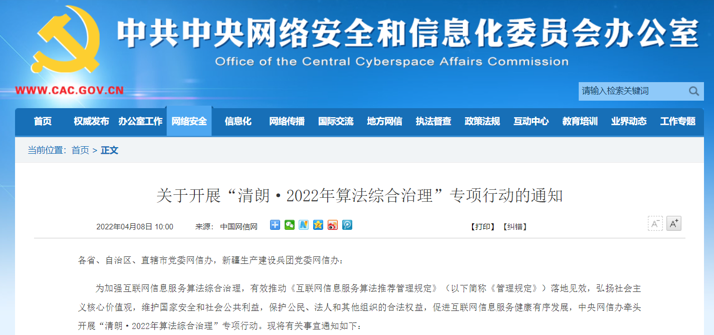 网信办宣布“清朗?2022 年算法综合治理”专项行动