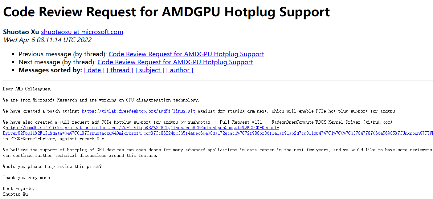微软研究院的工程师 Shuotao Xu 发布了以下请求,要求对 AMD GPU 热插拔支持进行代码审查,用于 Linux 操作系统。它专注于 Microsoft Azure 系统,以在需要时帮助支持基于 GPU 的热插拔的功能。微软研究小组也在 GitHub 上提出了类似的请求。