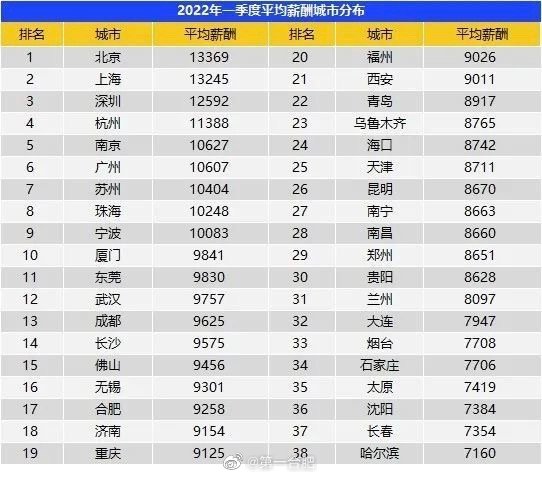 【你达标了吗?合肥平均工资9258元】你的薪资还好嘛?4月7日,智联招聘发布报告,数据显示,2022年第一季度全国38个核心城市平均薪酬为10014元/月,企业薪酬整体呈现“一升一降”趋势,合肥月均9258元,位列17名。