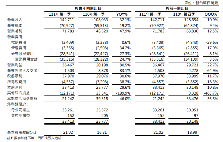 联发科第 1 季营业毛利为 717.8 亿元,季增 12.5%,年增 47.9%,毛利率为 50.3%,季增 0.7%,年增 5.4%。第 1 季毛利率较前季及去年同期增加,联发科说,主要因较佳的产品组合。