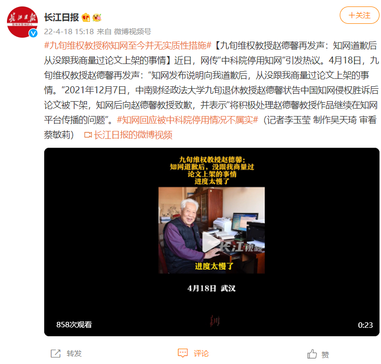 据长江日报报道,九旬维权教授赵德馨今日再发声:“知网发布说明向我道歉后,从没跟我商量过论文上架的事情。”
