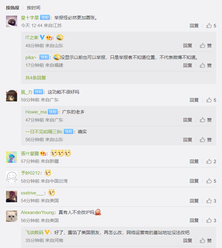 不过对于数码圈来说,可能没了很多乐趣。因为微博评论现在的尾巴被 IP 属地取代,不再显示用户所使用的手机型号了。意味着一些网友可能会冒充其他品牌粉丝来起哄了。