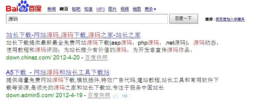 这个数据时笔者纵观众多行业关键词排名而估计出来的,大型门户站A5、新浪、搜狐等都也受到影响,下面我们看下截图百度搜索“源码”退回到了4月19日,但收录是正常的,因此我们不必担心近期网站关键词快照回档,属百度调整现象。
