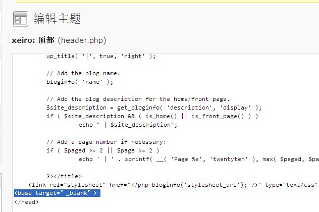在右侧找到顶部模板:header.php文件,打开在<head></head>之间插入代码:<base target=”_blank”>,如图: