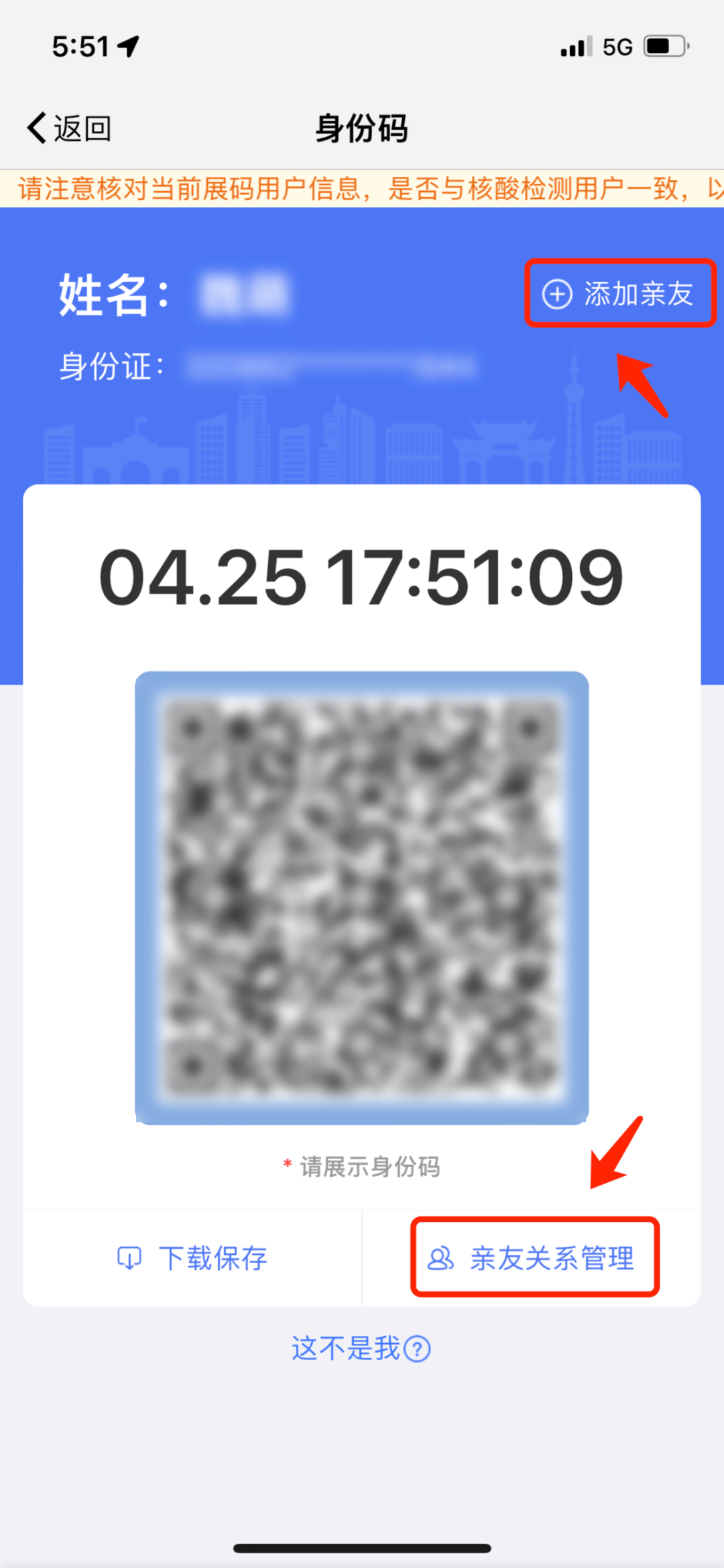由家人、亲友通过“我的南京”App-【身份码】-【亲友关系管理】,完成老人、儿童的信息维护,上传照片并保存打印“身份码”。