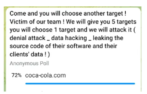 值得一提的是,黑客攻击前几天,Stomrous 在其 Telegram 群组上进行了一项调查,询问关注者要黑哪个公司,可口可乐获得了约 72% 的投票。
