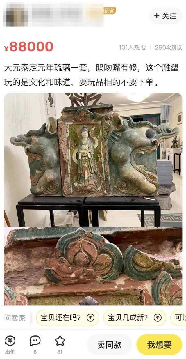4 月 28 日,有网友在微博举报,在闲鱼 App 页面发现疑似文物的商品在公开售卖,标价 88000 元。闲鱼上,该商品文字描述为“大元泰定元年琉璃一套,鸱吻嘴有修。”图片上,该古玩的背面字迹斑驳,依稀可辨认出“大元泰定元年”字样。