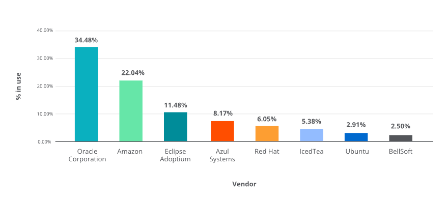 2020 年,甲骨文是最受欢迎的供应商,约占 Java 市场的 75%。而到了今年,这一数字降到了 34.48%,亚马逊的市场份额已大幅攀升至 22%(2020 年为 2.18%)。