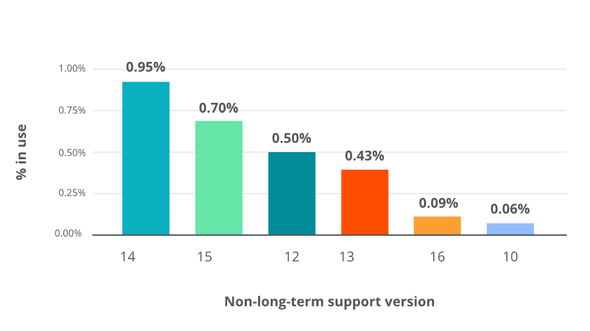 与 LTS 版本相比,非 LTS Java 版本的使用率仍然非常低,只有 2.7% 的应用在使用,其中 Java 14 最受欢迎。