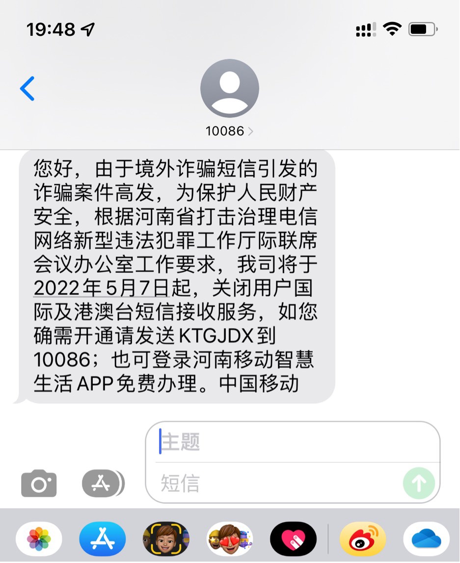30 日消息,中国移动河南发布短信通知用户称,由于境外诈骗短信引发的诈骗案件高发,为保护人民财产安全,根据河南省打击治理电信网络新型违法犯罪工作厅际联席会议办公室工作要求,公司将于 2022 年 5 月 7 日起,关闭用户国际及港澳台短信接收服务,如你确需开通请发送 KTGJDX 到 10086;也可登录河南移动智慧生活 App 免费办理。
