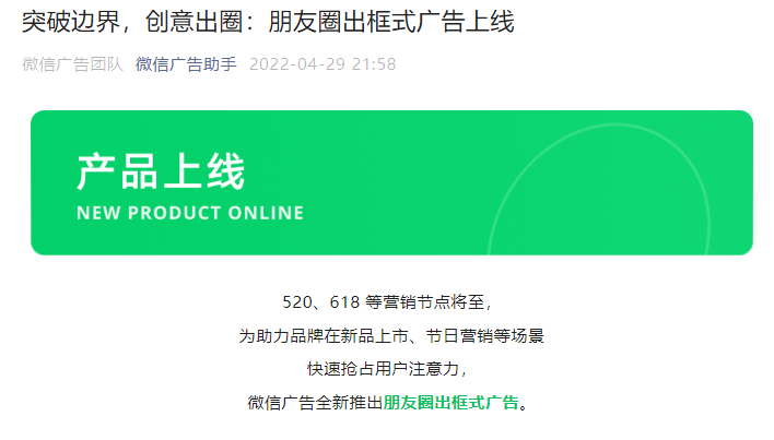 就微信官方介绍来看,此前朋友圈广告分为常规广告、组合式卡片广告、全幅卡片广告三种,上面展示的“朋友圈出框式广告”似乎是在组合式卡片广告的基础上进行开发的,其中对于视频和图片有一定要求。