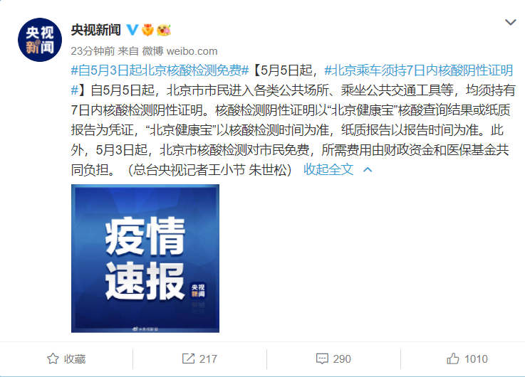 此外,5 月 3 日起,北京市核酸检测对市民免费,所需费用由财政资金和医保基金共同负担。