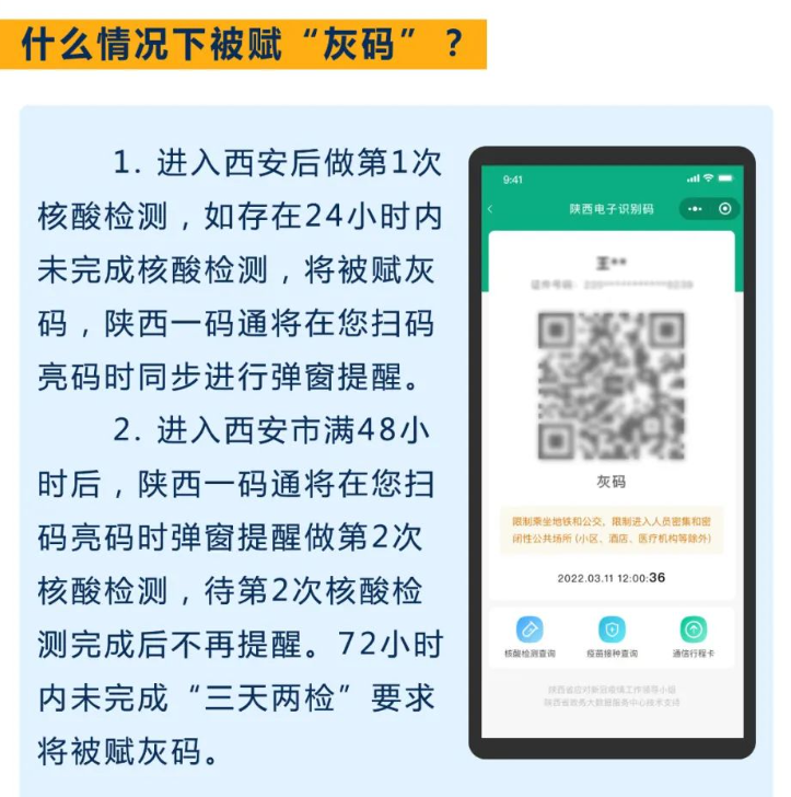 来(返)陕人员通过“一场两站”(机场、火车站、高铁站)和周边高速卡口进入西安后,未落实“三天两检”要求的将被弹窗提醒和赋灰码。