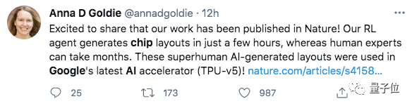 这一边,投稿到 Nature 的论文被质疑,没有严格遵循发表审批流程。谷歌和该论文的共同通讯作者 Anna D Goldie 对此回应称,因为这篇论文对此前成果的改动不大,因此不需要走完整的审批流程。