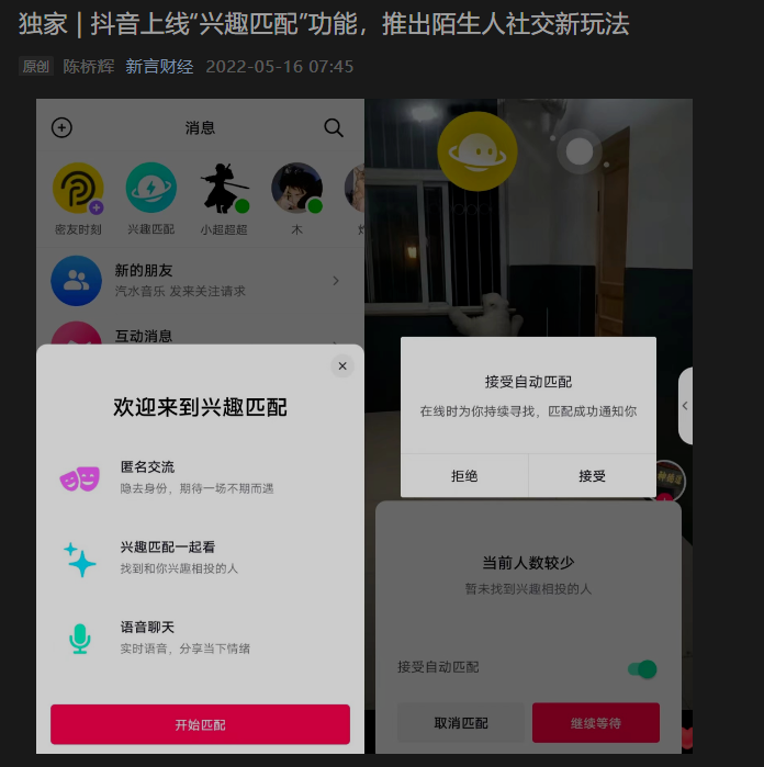 字节跳动社交心:抖音上线“兴趣匹配”功能