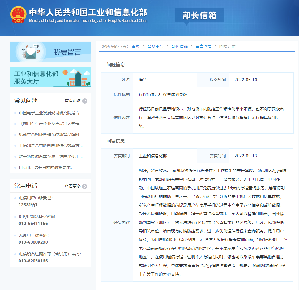 近日,有网友向工信部“部长信箱”提问,询问是否能按区县对基站进行分组,从而让行程码显示精确到县。