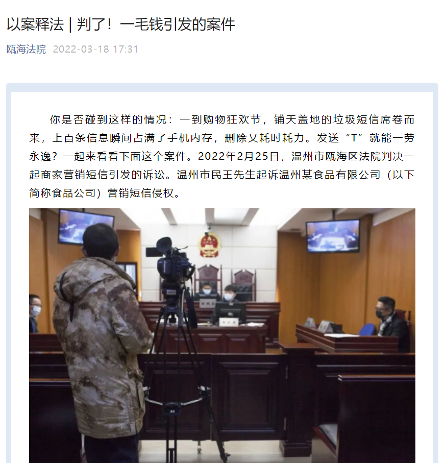 17 日消息,据温州市瓯海区人民法院公告,2022 年 2 月 25 日,温州市瓯海区法院判决一起商家营销短信引发的诉讼。温州市民王先生起诉温州某食品有限公司(以下简称食品公司)营销短信侵权。