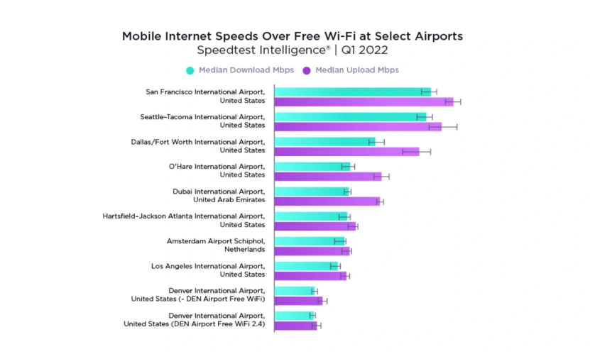 在十大最快的免费 Wi-Fi 机场名单上,美国独占八席,其中美国旧金山国际机场位居榜首,提供 176.25Mbps 的中位下载速度,其次是西雅图-塔科马国际机场、达拉斯 / 沃斯堡国际机场和芝加哥奥黑尔国际机场。