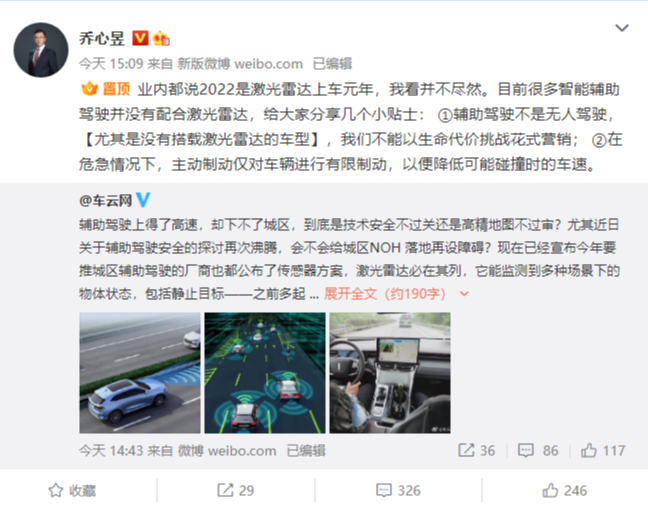 他表示,“业内都说 2022 是激光雷达上车元年,我看并不尽然。目前很多智能辅助驾驶并没有配合激光雷达,给大家分享几个小贴士: