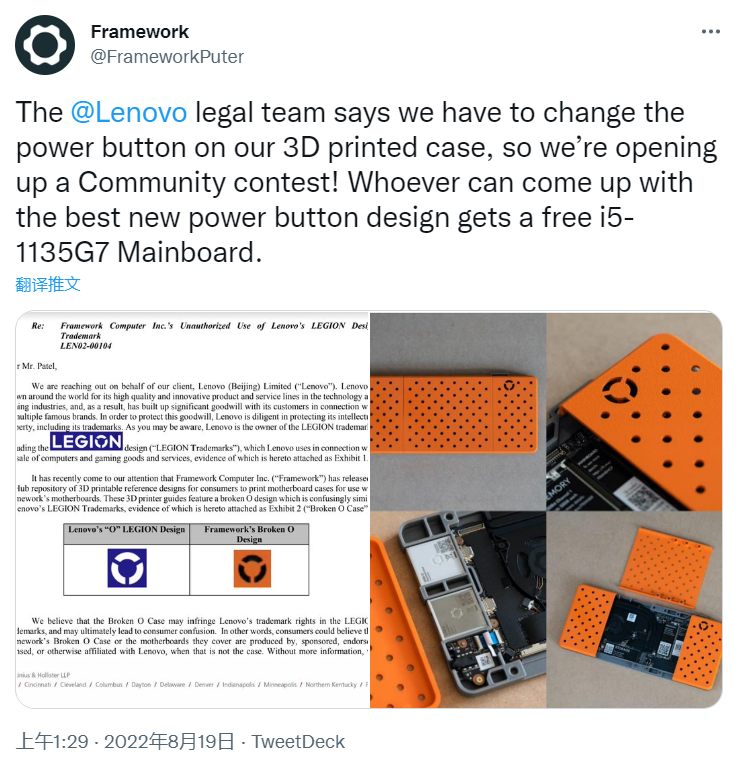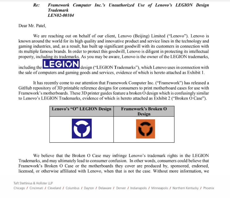 Framework 收到联想律师函:3D 打印外壳图案侵权“拯救者”商标
