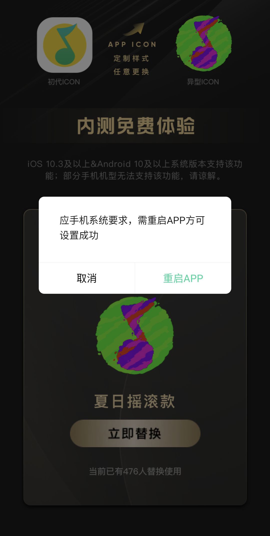 目前 QQ 音乐定制图标只有“夏日摇滚款”可更换,点击替换后需要重启 App,然后就可以显示新图标了。