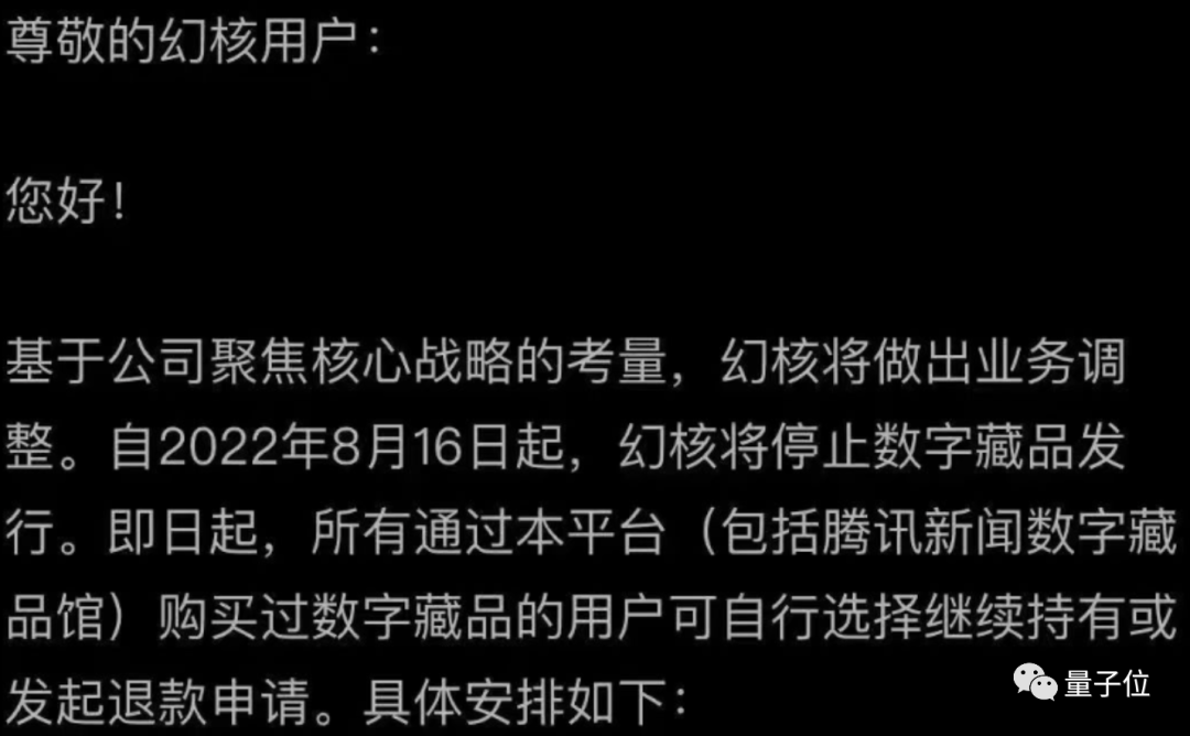 现在,大厂们开始退出了。这两天,腾讯数字藏品平台(NFT 交易软件)幻核也发布公告,停止数字藏品发行,用户可选择继续持有或发起退款申请。