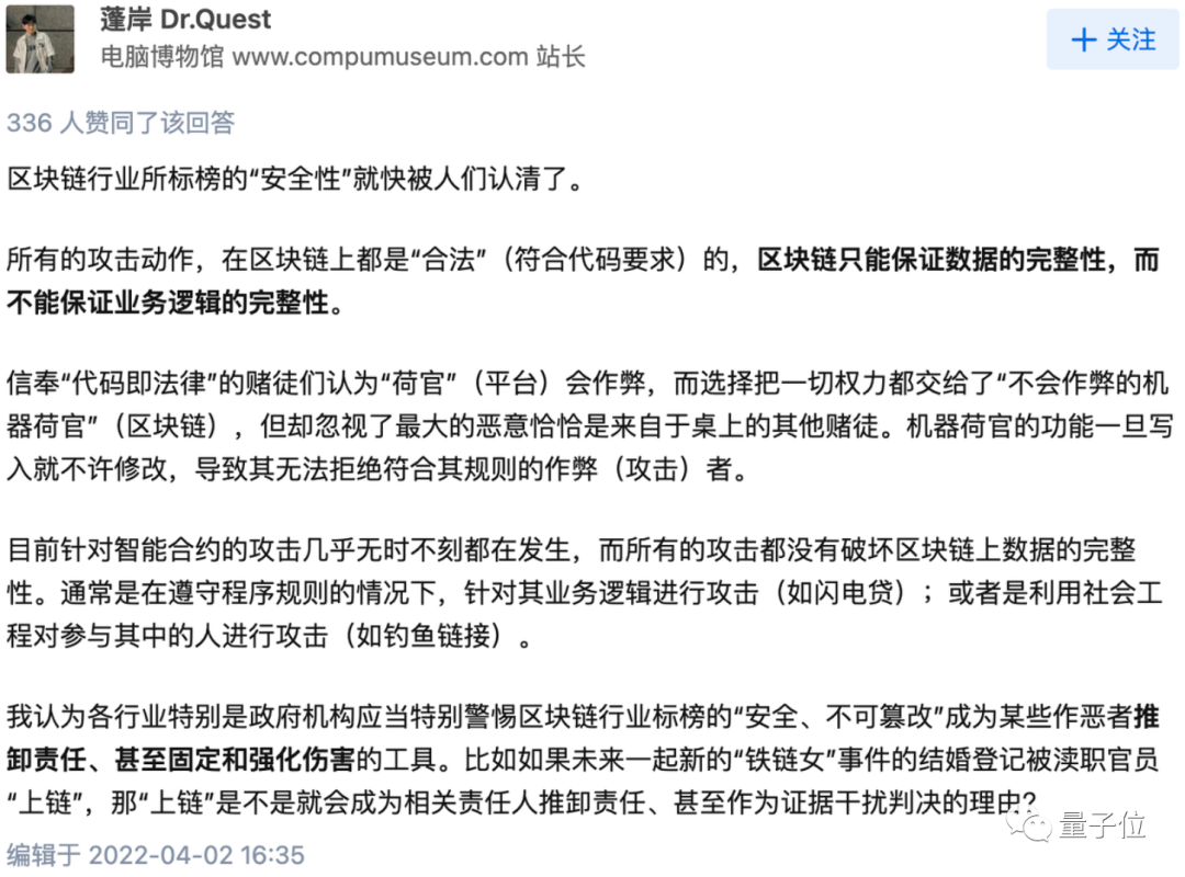对此知乎 @蓬岸 Dr.Quest 分析表示:区块链只能保证数据的完整性,而不能保证业务逻辑的完整性。