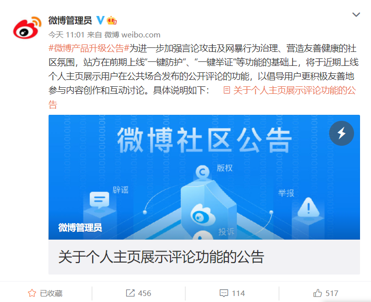8 月 22 日消息,据微博管理员发布,为进一步加强言论攻击及网暴行为治理、营造友善健康的社区氛围,站方在前期上线“一键防护”、“一键举证”等功能的基础上,将于近期上线个人主页展示用户在公共场合发布的公开评论的功能,以倡导用户更积极友善地参与内容创作和互动讨论。